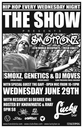 Vancouver's Fresh Coast MCs Emotionz (4th World Occupants), Smoxz, and Genetics are joined by Saskatoon DJ The Gaff for a night of Hip Hop at THE SHOW. Plus Degree One, the Knowmatic MC, and Rhay. Open mic from 10 - 11pm.