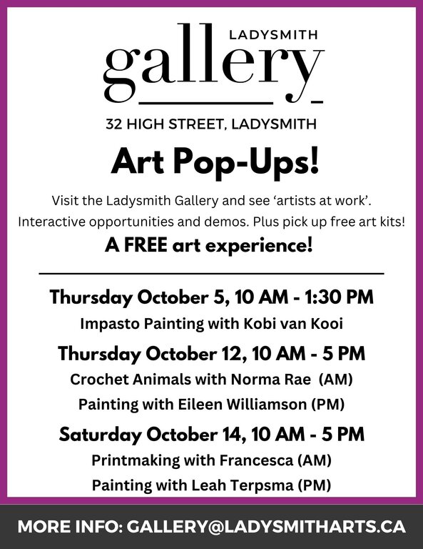 Visit the new Ladysmith Gallery and see 'artists at work'! Featuring interactive opportunities, demos and free art kits, we will have artists over 3 days sharing their art practice with the public.