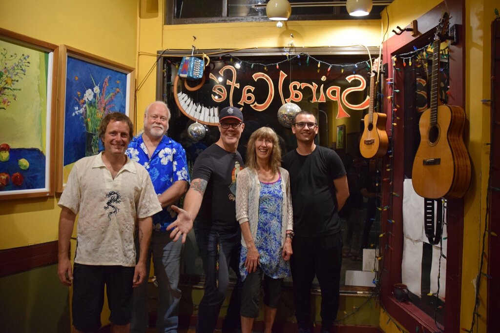 The Spiral Café’s Big Open Mike Band grew from the roots of a seed planted in 2002 when Big Mike Raymer as new co-owner of The Spiral started attending Thursday nights at the coffee shop to host a community-friendly open mic. Today, The Big Open Mike Band (aka The B.O.M.B) is composed of a group of talented regulars who love the Spiral Café, several of them having played together for close to ten years while backing up performers on Open Mic Thursdays.