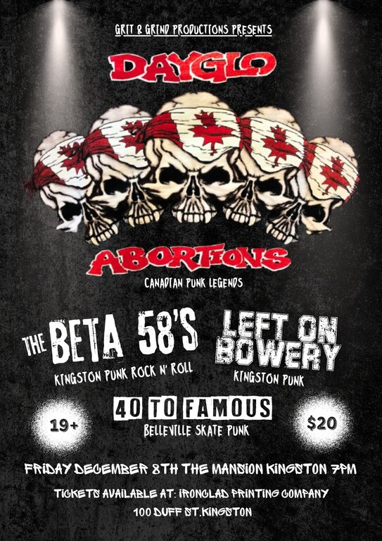 Grit & Grind Productions presents Punk Rock Legends: Dayglo Abortions (Victoria BC) with The Beta 58's, Left On Bowery & 40 To Famous live from the Mansion Kingston Friday Dec.8th 2023. $20 advanced tickets, 19+, doors at 7pm show starts at 7:30pm