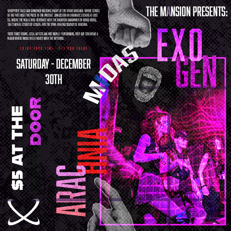 A collection of local Kingston artists playing a show to end the year off with a bang. Opening the set at 8:30 will be local rapper and hip hop artist Midas Music. Followed up by Exogen; a band playing experimental metal and stoner rock. Finally closing off the set will be Arachnia, a heavy sludge metal band that'll make you mosh. $5 tickets at the door, doors open at 8:00!