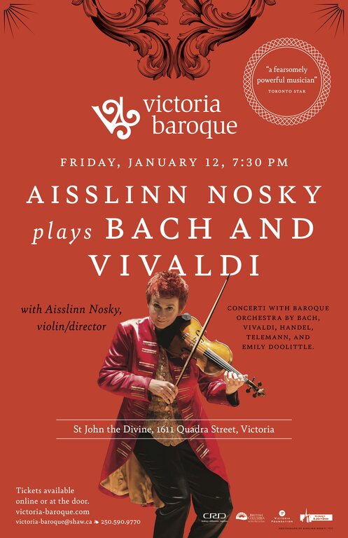 A riot of fiery energy and splendour, as the celebrated violinist Aisslinn Nosky leads Victoria Baroque in concerti by JS Bach, Vivaldi, Handel, Telemann, and Emily Doolittle.