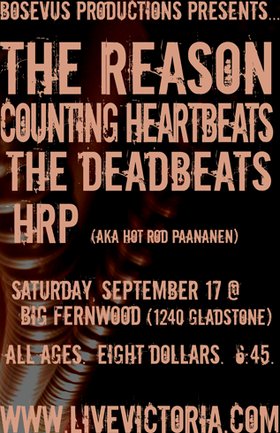 The Reason, of Smallman Records, return to Victoria. Locals Counting Heartbeats, The Deadbeats, and HRP (formerly Hot Rod Panannen) make this one quality line-up.