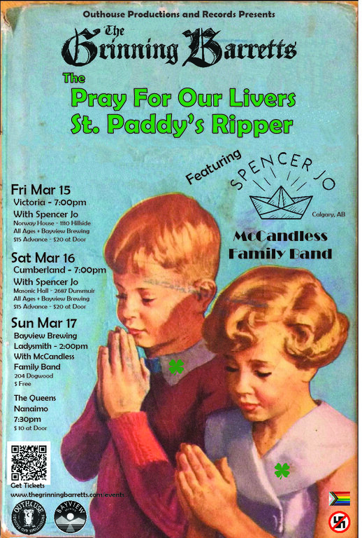 The Grinning Barretts are a 5 piece, bagpipe strangling, vocal chord mangling, Riot Brewing imbibing, Vancouver Island Celtic punk rock frenzy. They've taken Celtic sounds & mashed them up with gritty punk rock passion to create a wild ride of originals, tradionals & additionals that will move your feet into jig for-mation & bring out your inner rabblerouser.