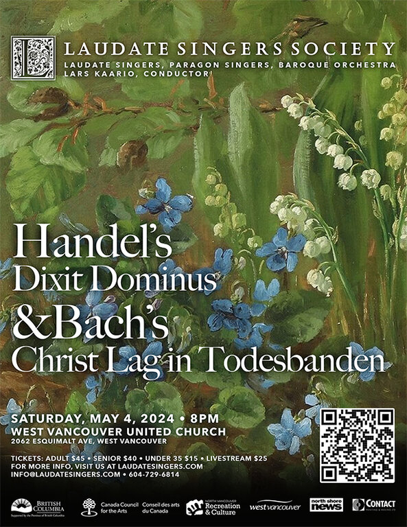 Laudate Singers, Paragon Singers and Baroque Orchestra invite you to join with them in an evening of glorious, soul-filling music. Handel's Dixit Dominus and Bach's Christ lag in Todesbanden are masterful pieces both written in 1707 by Bach and Handel, two young German composers whose music is still loved over 300 years later.