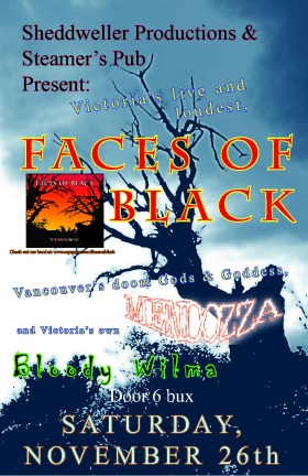 Faces of Black is joined by steller stoner heads, Mendozza, for a night of heaviness and groove you can't even imagine. Get you party bootz on and rock out with us at Steamer's this Saturday. Opening guests will be former Wooly Mammoth members in their newest band; BLOODY WILMA! Simply a show you can't miss out on!