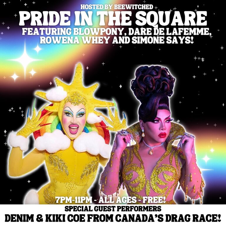 { Pictured is information about an event called Pride in The Square. This event is hosted by a drag performer called BeeWitched featuring BlowPony, Dare De LaFemme, Rowena Whey and Simone Says. Two extra special guest performers from Canada’s Drag Race Season four Kiki Coe and Denim will be guest performers. The event is free, at Springer Market Square, it is all ages and is on June 15th between 7:00pm to 11:00pm. }