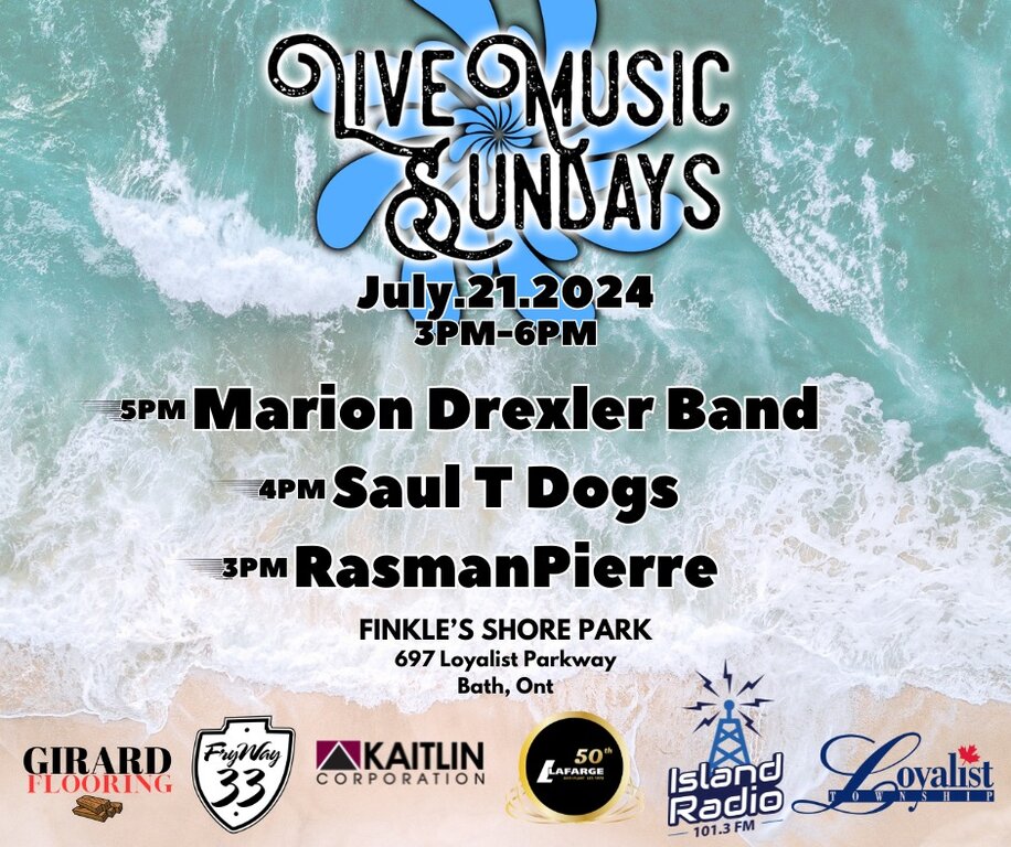 Live Music Sundays: Marion Drexler Band, Saul T. Doggs, Rasmanpierre @ Finkle's Shore Park Jul 21 2024 - Jan 8th @ Finkle's Shore Park