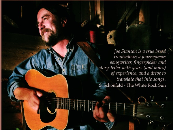 Take the musical traditions of Folk, Bluegrass, and country, let them simmer over a few dozen Canadian winters, add a little virtuoso woodshed fingerstyle guitar and lyrics from life, and you have Joe Stanton! Joe’s philosophy of “playing wherever they’ll listen” has taken him and his Martin D-28, on a 30-year journey from his favourite haunts of home on the Sunshine coast, to a concert in a hot air balloon over the Swiss Alps, to The Kerrville Folk Festival in Texas and The World Finger-Picking Championships in Winfield, Kansas.