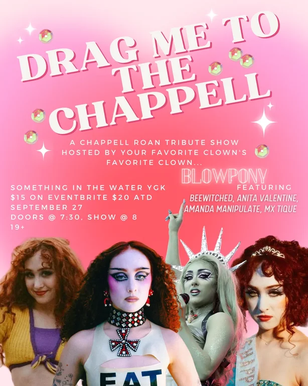 Join us for a larger-than-life evening on September 27th at 8PM as Something in the Water transforms into the Pink Pony Club for one night only as a cast of drag and burlesque performers share some of their favorite Chappell hits with you! Hosted by BLOWPONY, featuring performances by BEEWITCHED (@beewitcheddrag, Kingston ON), AMANDA MANIPULATE (@amanda.manipulate, Kingston ON), MX. TIQUE (@mx.tique, Ottawa ON), and ANITA VALENTINE (@anita_valentine_official, Toronto ON)! You don’t want to miss this show!