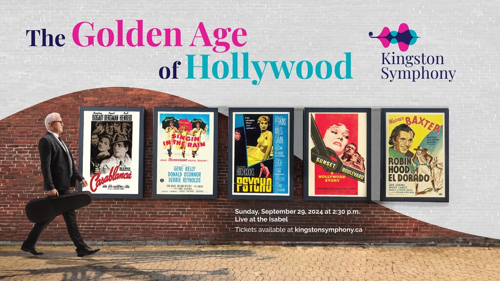 The Kingston Symphony's 2024-2025 season starts on Sunday, September 29, 2024 with a Masterworks concert titled The Golden Age of Hollywood. With music from Casablanca, Robin Hood, Sunset Boulevard, Singin’ in the Rain, and more, it's the perfect time machine to transport yourself to the glamorous world of show biz as it existed in the 30s, 40s, and 50s. During the middle of the 20th century, the very best musicians in the world were part of the MGM and Warner Bros. orchestras. The gifted compositional minds of the romantic symphonic era all turned their attention to scoring the iconic films which would come to define Hollywood. This concert salutes these true masters who created some of the greatest music of the era with extraordinary colour, flair, and sweep.