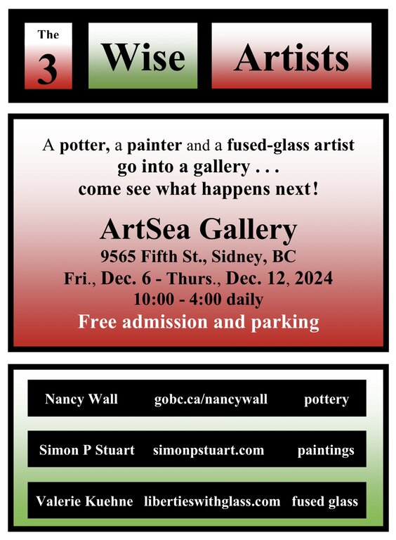 Discover a celebration of artistry and expertise at ArtSea Gallery from December 6 to 12, 2024. This exquisite exhibition, open daily from 10:00 AM to 4:00 PM, brings together the unique talents of three exceptional artists—a potter, a painter, and a fused glass artist. Immerse yourself in a stunning array of artworks designed to captivate your senses and elevate your surroundings.