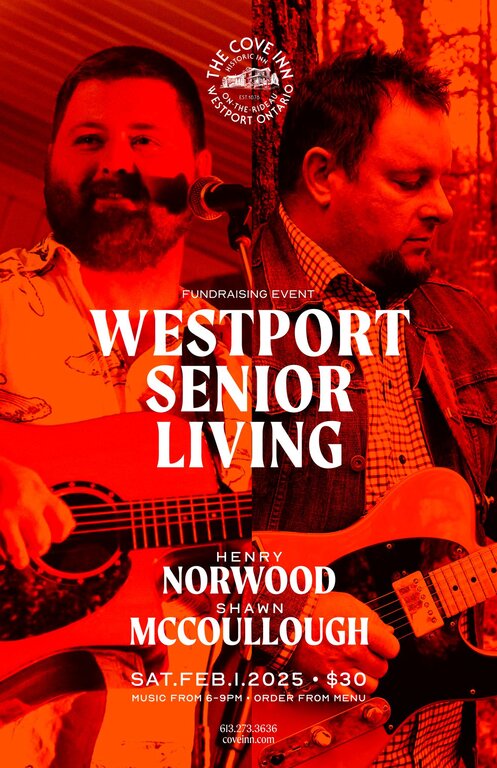 A fundraiser for Westport Senior Living of Westport, ON! Neighbours helping neighbours age safely and well at home in Westport, Ontario and surrounding area. Music by local classic country music heroes and masters, Henry Norwood and Shawn McCullough of Westport, naturally! Come and support a great cause that helps promote a great quality of life in the Westport community! Saturday, February 1st, 2025 from 6-9pm. $30 cover goes to the charity and music! Feel free to order off of the menu.