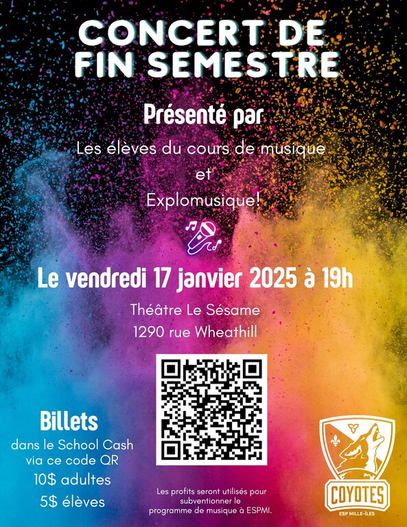 Mr. Nick's instrumental music class, as well as the junior and senior Explomusique groups, will be performing on January 17, 2025 at 7:00 p.m. at Théâtre Le Sésame, located at the same address as the Mille-Îles high school. 1290 Wheathill Street in Kingston.