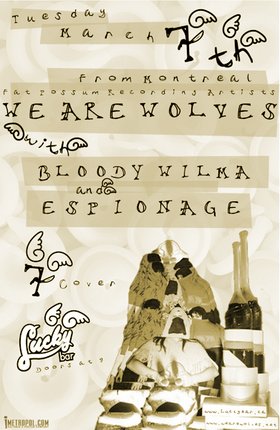 From Montreal, Fat Possum recording artists We Are Wolves are a three-piece post-everything Indie band. With Bloody Wilma (featuring members of Wooly Mammoth) and Espionage (featuring members of The Fine Options), and DJ Longshanks (SOLD, Hang The DJ). www.wearewolves.net