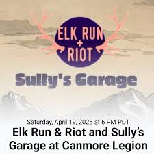Live at the Canmore Legion. Elk Run + Riot with Sully's Garage. Doors at 7pm show starts at 8pm. Saturday April.19th 2025