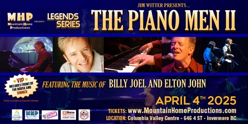 Mountain Home Productions proudly presents the third installment of their 2025 Legends Series: The Piano Men II in the vibrant Music Town, Invermere, BC! Picking up where The Piano Men left off, this captivating sequel is a time machine stuck in the 70s, ready to take you on an unforgettable journey into the 80s.