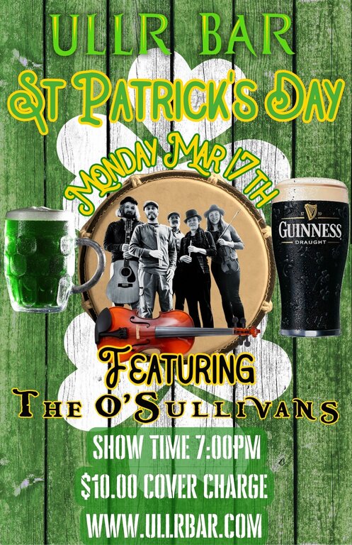 At Ullr bar we love a day to celebrate, and this is one of the biggest one of the year, St Patrick’s day! Join Ullr for some traditional Irish drinks and enjoy some free music from The O’Sullivans. $10.00 cover. Live local Irish music is from 7:000pm until 11:00pm. Drink specials all day long. Come one down and join the fun.
