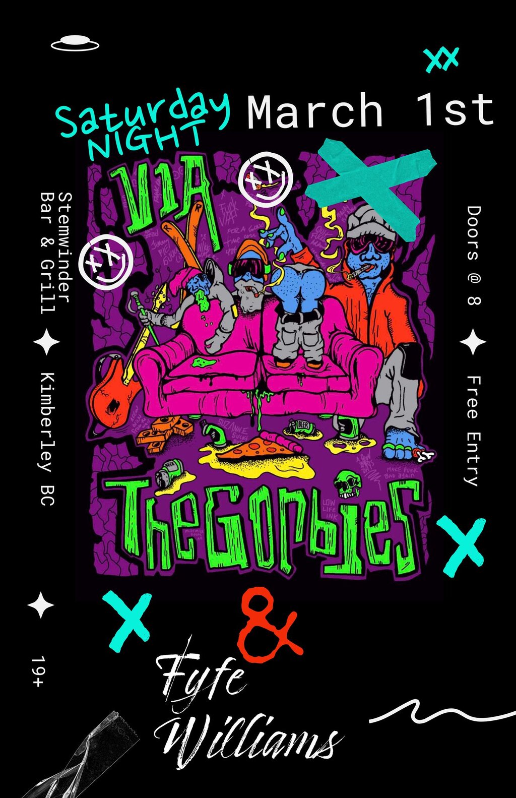 With the help of folk'n'roll group Fyfe Willliams. These local boys are sure to get your gorby gaps giddy and butts outta your chairs.