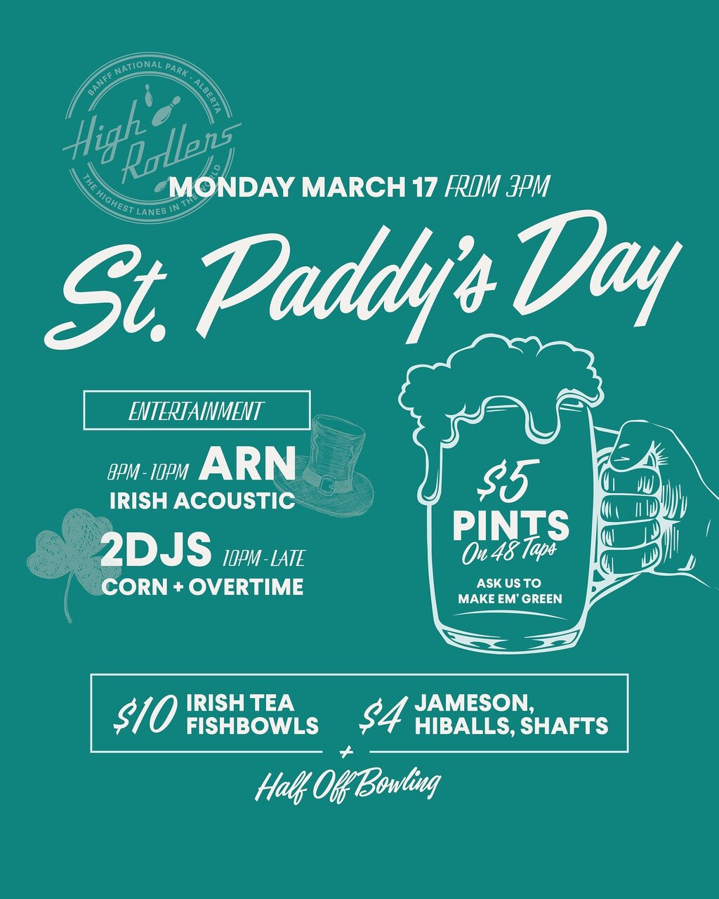 St. Paddy's Day at High Rollers with $5 pints on 48 taps that can be made green! $10 Irish tea fishbowls, $4 Jameson, Hiballs & Shafts + Half Off Bowling!