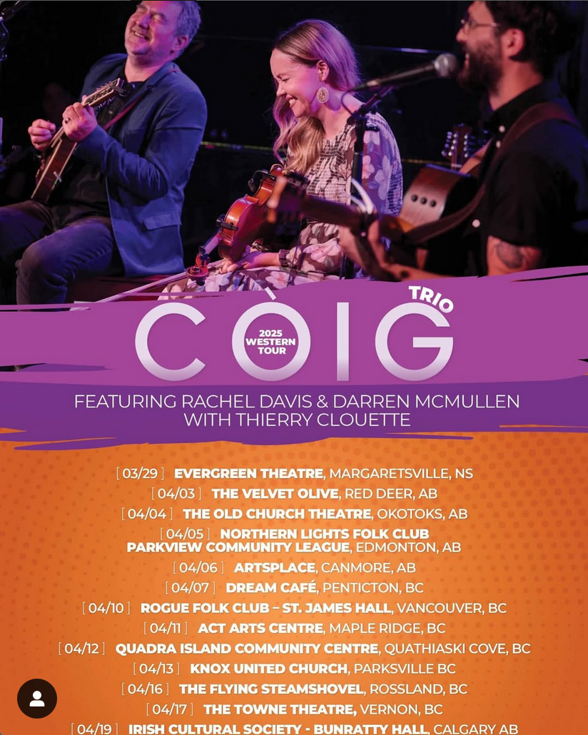 Còig is one of Atlantic Canada’s most exciting Celtic traditional groups. With a fiery Celtic style as their musical core, Rachel Davis & Darren McMullen, accompanied by Zakk Cormier, offer a fresh and exhilarating mix of traditional tunes, lively instrumentals and contemporary songs performed on over a dozen instruments (vocals, fiddles, guitar, banjo, mandolin, viola, bouzouki, whistles, and more)-in a lot of non-traditional ways! Shifting between century-old tunes of past generations to original and upbeat compositions with infectious energy, Còig is an unparalleled music force.