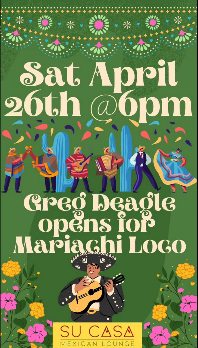 Starting at 6pm Local Legend, Greg Deagle, will be warming up the stage for Mariachi Loco to keep it hot and toasty for the evening.