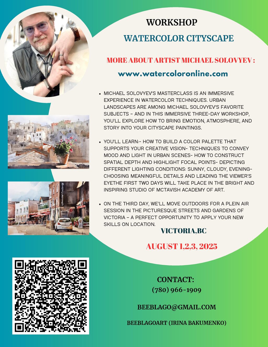 Join a special 3-day workshop with internationally acclaimed watercolor artist Michael Solovyev, set in the vibrant and scenic city of Victoria, BC.