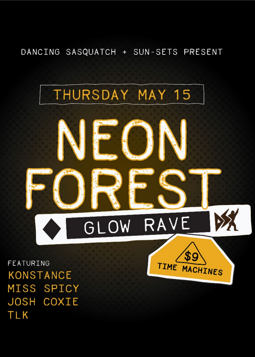 THURSDAY MAY 15TH 🌟🌲 Step into the Neon Forest with @sun.set.sesh for a glow rave – white or neon attire encouraged! 4 local DJs and $9 Time Machines to keep you grooving all night long! Free guest list with registration!