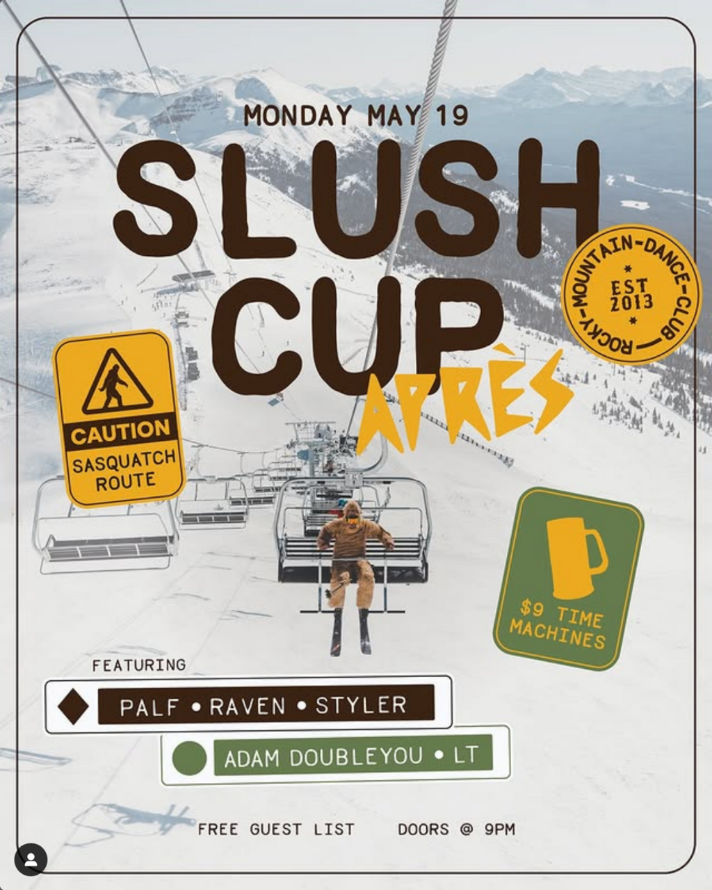NEXT MONDAY 🎿🏂 Give the season a proper send off with a few of the Squatch’s OG local DJs! $9 Time Machines + $5 Highballs/Shafts/Shooters!! This is a night you won’t want to miss so get on the guest list at the link!