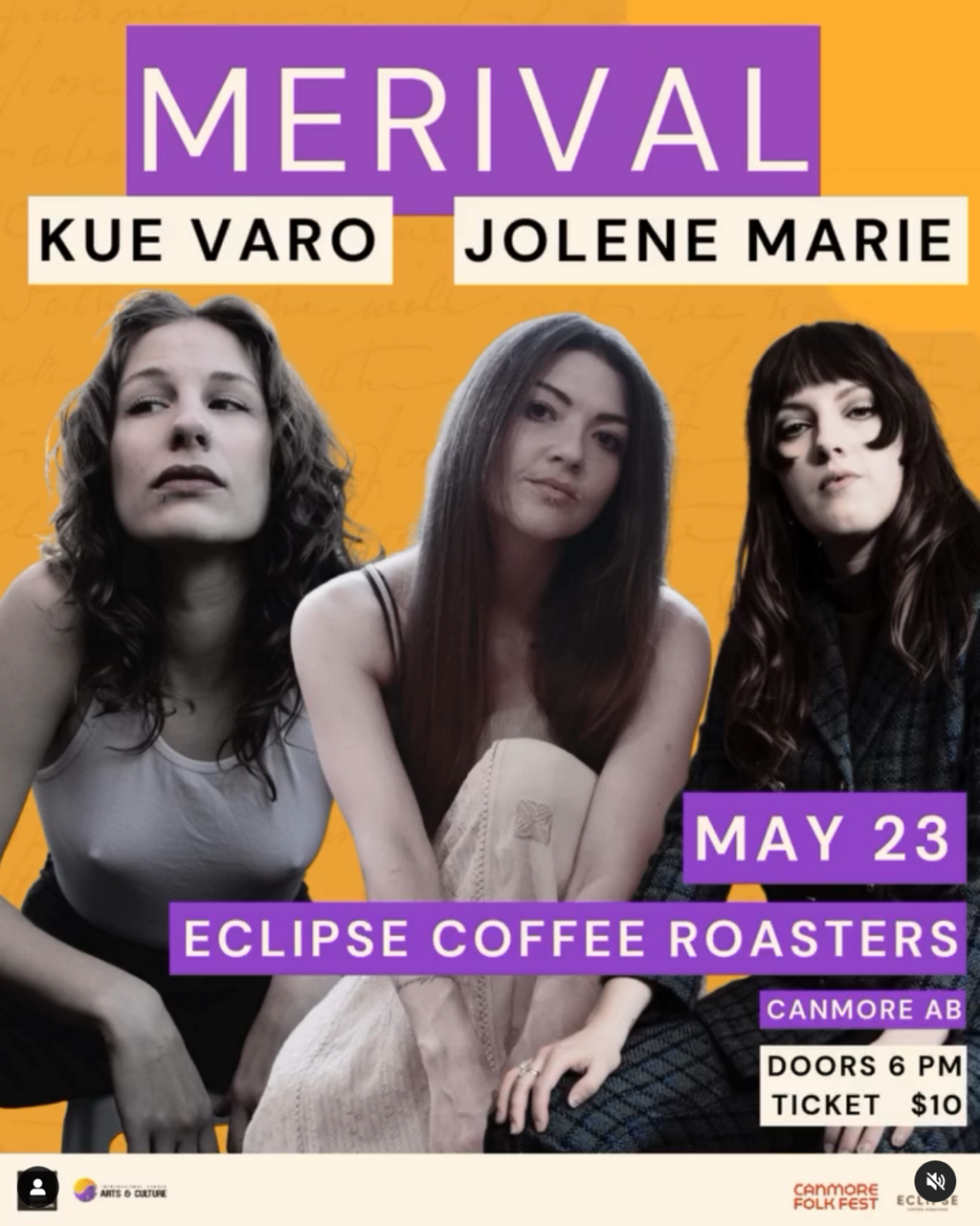 Experience an evening of raw emotion, layered harmonies, and spellbinding storytelling as three distinct voices share the stage at Eclipse Coffee Roasters. Calgary’s Jolene Marie sets the tone with melancholic yet hopeful songs, weaving bold vulnerability through gentle, looping acoustic guitar—echoes of Cat Power and Mazzy Star in her wake. Toronto’s Merival brings her signature blend of philosophical introspection and intricate arrangements, drawing listeners into a world of heartache, healing, and growth with a voice both powerful and unguarded. Rounding out the evening, Kue Varo conjure a gothic folk dreamscape—where Twin Peaks mystique meets high-drama balladry, led by Varo’s haunting vocals and cinematic flair.