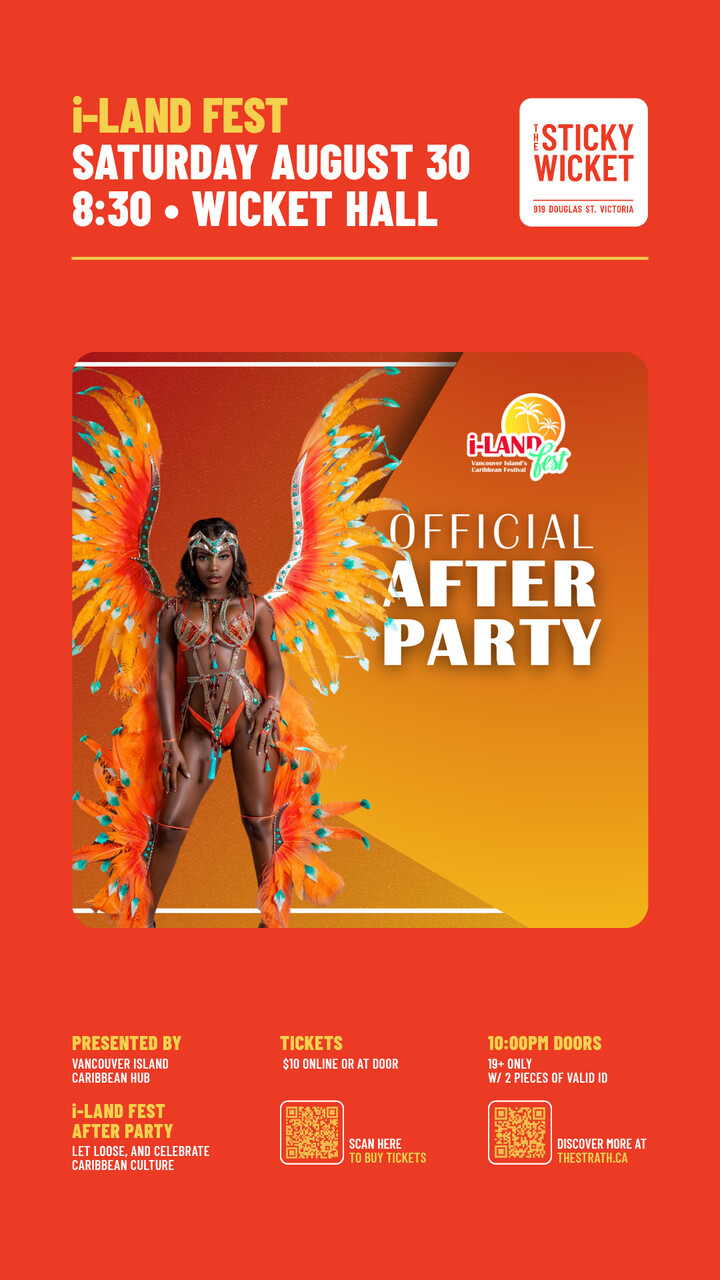 The vibes don’t stop after the festival! Head over to Wicket Hall (919 Douglas St, Victoria, BC) for the Official After Party — the final fete to wrap up the weekend. Let loose, dance your heart out, and celebrate Caribbean culture with the i-Land Fest fam one last time.