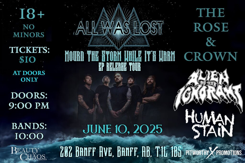 Join us Tuesday June 10th at The Rose and Crown. Last Pitworthy Promotions show of the year. We are stoked to team up with Beauty In Chaos Productions to bring All Was Lost (Edm) with our buds Alien to the Ignorant (Sask) i swear these guys have played Banff more than some of the locals also the boys in HUMAN STAIN are gonna get the stage warmed up so be sure to show up early and support this killer line up.