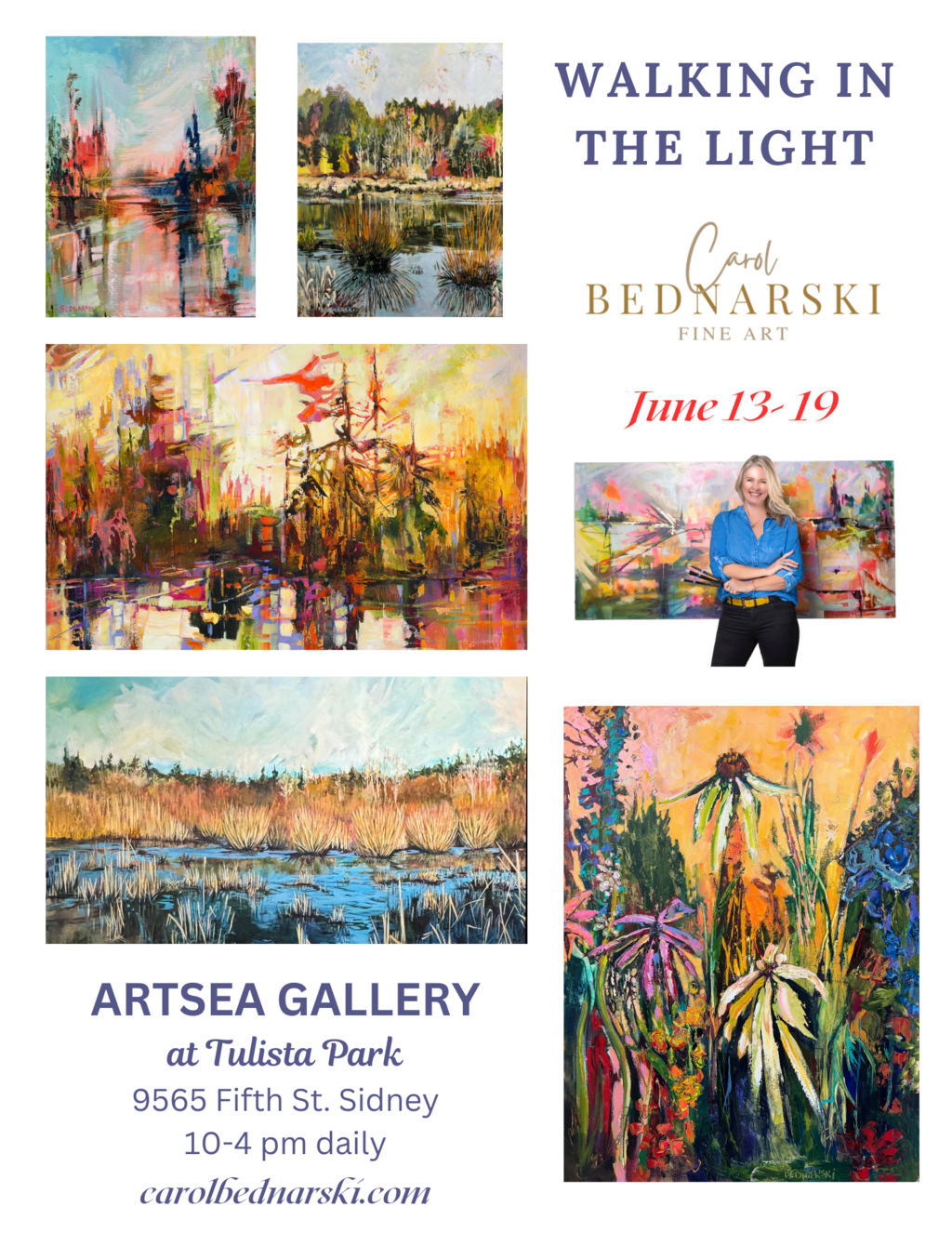 This week-long exhibit is open daily at the ArtSea Gallery in beautiful Tulista Park, Sidney. Artist Carol Bednarski presents a striking collection of vibrant and bold works. Her landscapes, seascapes, and florals are painted in her distinctive style, featuring expressive brushwork, palette knife techniques, and a fearless use of color. In addition to original paintings for sale, Fine Art Giclée Prints and art cards will also be available. The artist will be in attendance daily from 10 a.m. to 4 p.m. and looks forward to welcoming visitors.
