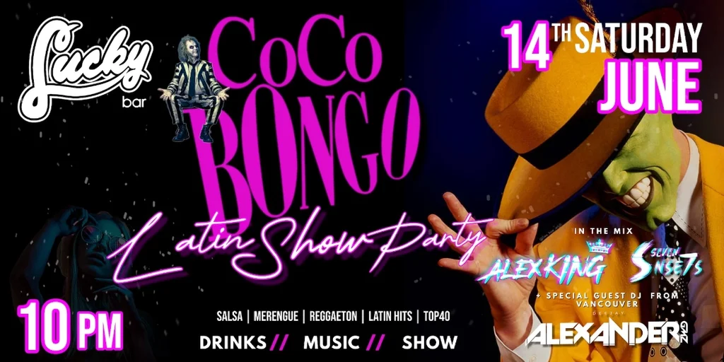 It's the Coco Bongo Latin Show Party with DJs Alex King, Alexander, and Seven Sen7s.