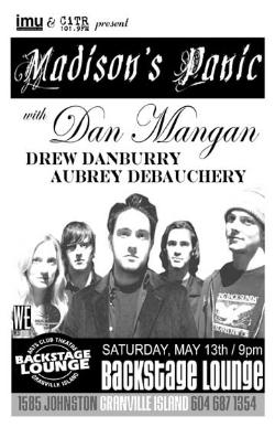Saturday May 13th IMU & CiTR present Madison's Panic, Dan Mangan, Drew Danburry (from Utah) & Aubrey Debauchery @ The BACKSTAGE LOUNGE, 1585 Johnston Street, Granville Island . 9pm / $10 -:- Info: 604 687 1354
