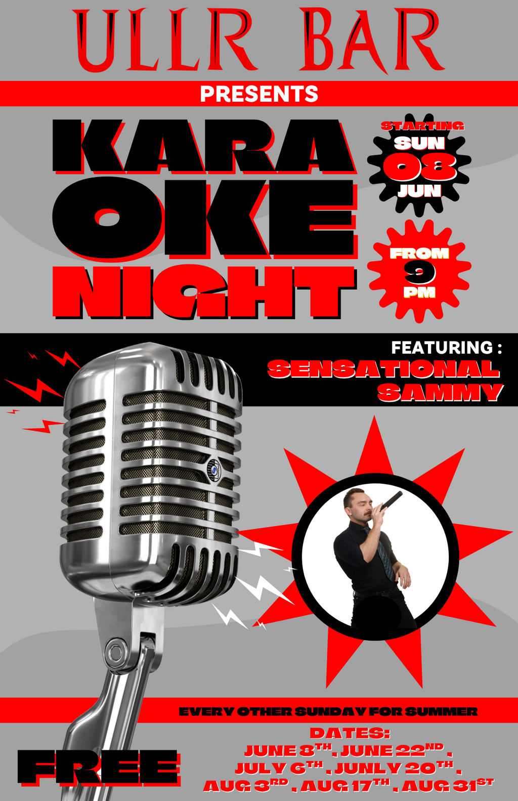 He is back and better than ever. Sensational Sammy is back to host karaoke night at Ullr Bar. Starting Sunday June 8th at 9:00pm Ullr will be hosting a free karaoke night. Come on down and join the all-star fun. This will be happening every send Sunday. Here are the upcoming dates for you to sing your heart away. JUNE 8TH, JUNE 22ND , JULY 6TH , JUNLY 20TH , AUG 3RD , AUG 17TH , AUG 31ST Glory for the Valley!