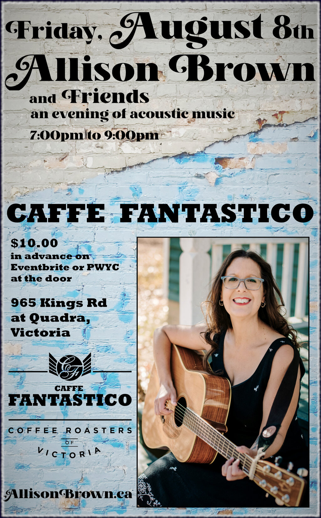 Join Ontario songbird Allison Brown for a return performance at Caffe Fantastico in Victoria on Friday, August 8th with a collection of musical friends including Dan Belgue and Dan Henshall.