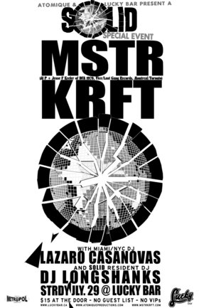 SOLID presents rare guest DJ appearances by the leading dance music producers in North America. MSTRKRFT is the electronic side project of Death From Above 1979's Jesse F. Keeler and his band's producer Al-P. Through their dancefloor remixes (...for DFA1979, Bloc Party, Metric, Buck 65, Wolfmother, and more...) and their own debut album ('The Looks'), they have quite literally re-defined what dance music can be in the Post-Rave era. With Miami DJ Lazaro Casanovas and Vic's own DJ Longshanks. This is the future of Dance Music. Space is limited - sorry no advance tickets, guest list or VIPs. Visit www.atomiqueproductions.com, www.mstrkrft.com, for more info.