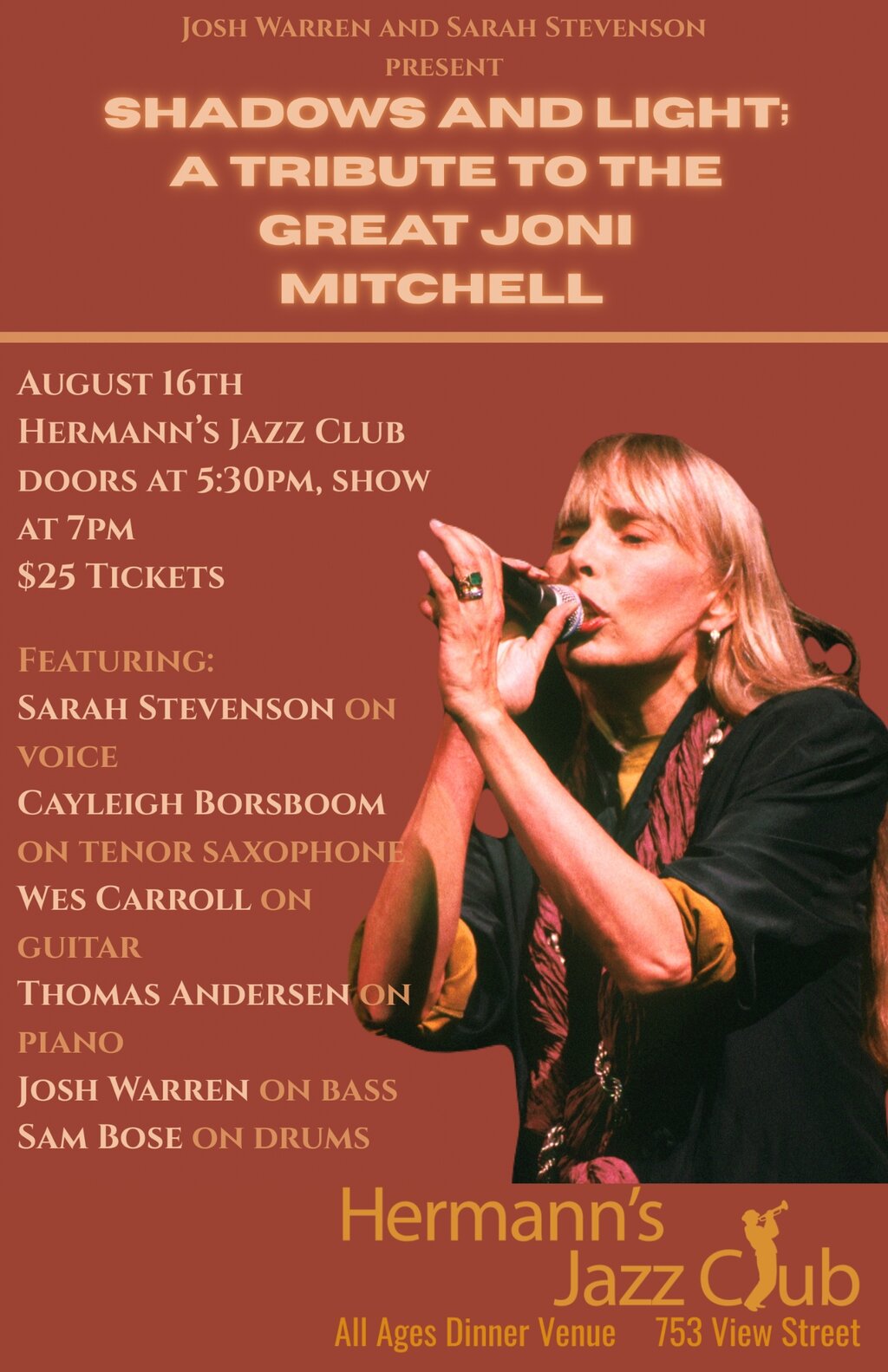 Shadows and Light: a tribute to the music of Joni Mitchell - Jan 24th @ Hermann's Jazz Club