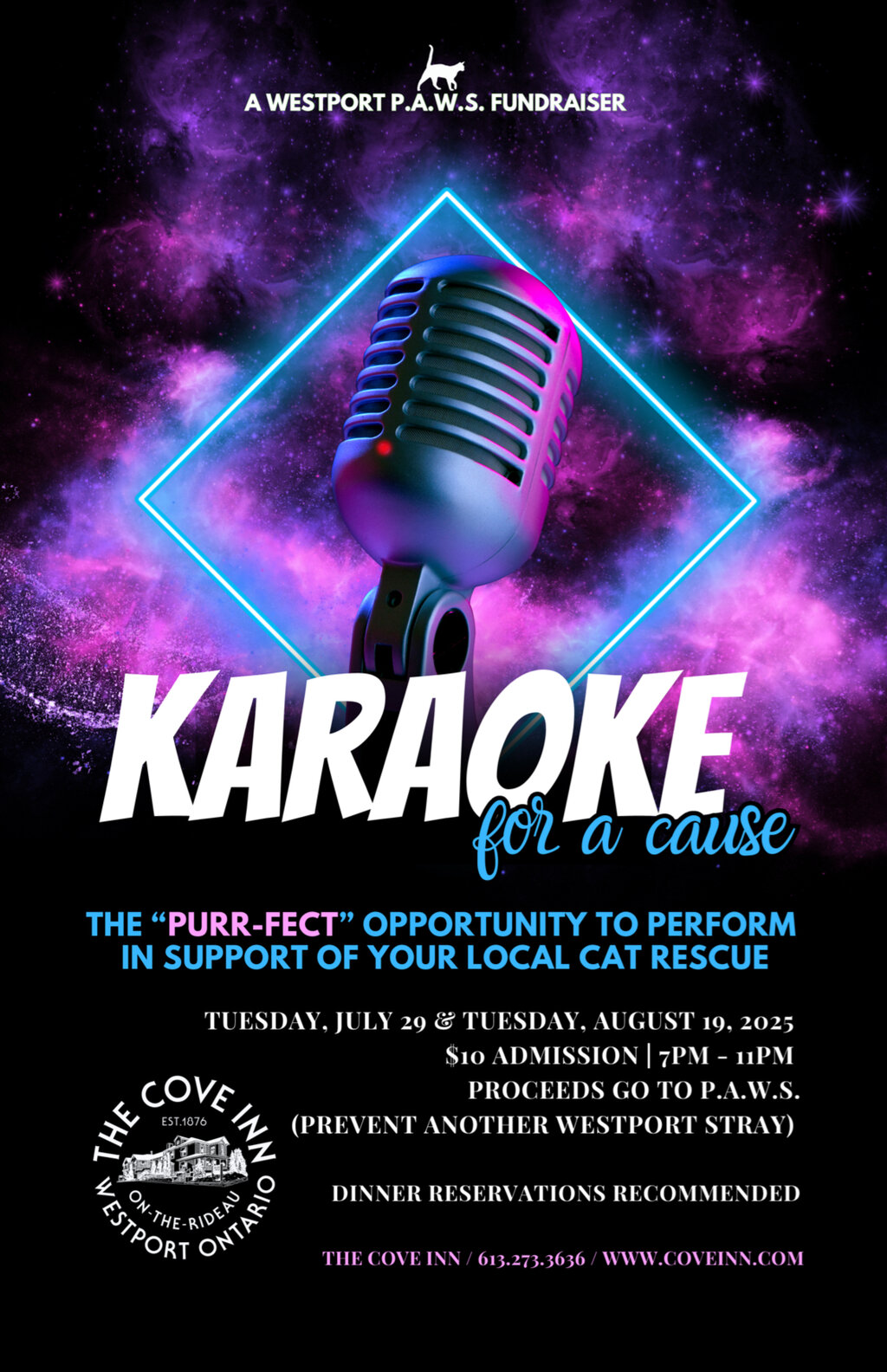 Come and sing karaoke to celebrate spring and help fundraiser for P.A.W.S., Prevent Another Westport Stray! July 29 and August 19. 7-10pm at The Cove Inn. $10 admission and donation.