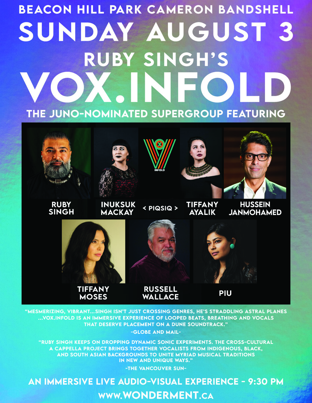Wonderment's 10th Edition is headlined by a special audio-visual immersive performance by 2022 Juno Nominees for Global Music Album of the Year, Ruby Singh's Vox.Infold. This project is a supergroup of regional artists featuring Ruby Singh, Tiffany Ayalik and Inuksuk Mackay of PIQSIQ, Lil'wat composer Russell Wallace, Dene singer-songwriter Tiffany Moses, Ismaili artist Hussein Janmohamed, and Piu. There will be accompanying video art by Ruby Singh and the award-winning Chimerik, projected with a high-lumen laser projector onto a 16' screen provided by Open Space Gallery.