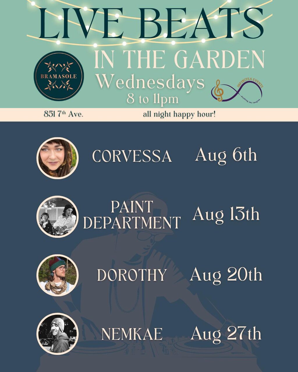 Check out the monthly poster to see who's bringing the beats on Wednesdays all Summer at Bramasole.