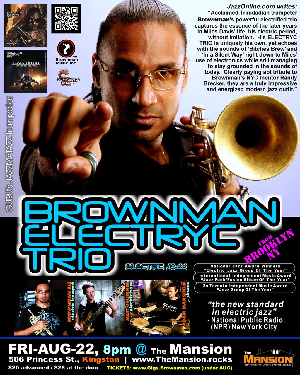 In recent years, when not touring the globe the Brooklyn based multi-award-winning Trinidadian-born trumpet player BROWNMAN ALI -- the last trumpet player for iconic jazz-hip-hop group Guru's Jazzmatazz -- spends much of his artistic time in the exploration of modern “chordless” jazz -> music produced without a chordal instrument (guitar or keyboard). He had previously explored this tonal quality for a decade with his highly lauded latin-jazz group CRUZAO, and more recently with his heavily decorated & now internationally acclaimed Miles Davis influenced BROWNMAN ELECTRYC TRIO. Taking a similar trajectory as the acclaimed 2009 debut release "Juggernaut", this highly energized bombastic trio’s 2013 sophomore release “Gravitation: A Study In Freefall” -- on Brownman’s own label Browntasauras Records -- shot to number 4 on the iTunes USA jazz charts and was declared “the new standard in electric-jazz” by National Public Radio (NPR) in New York City. Among a long list of awards & accolades, the trio would win an International Independent Music Award for "Jazz-Funk Album of the Year", 3 Toronto Independent Music Awards for "Jazz Group of the Year" and a National Jazz Award for "electric jazz group of the year".