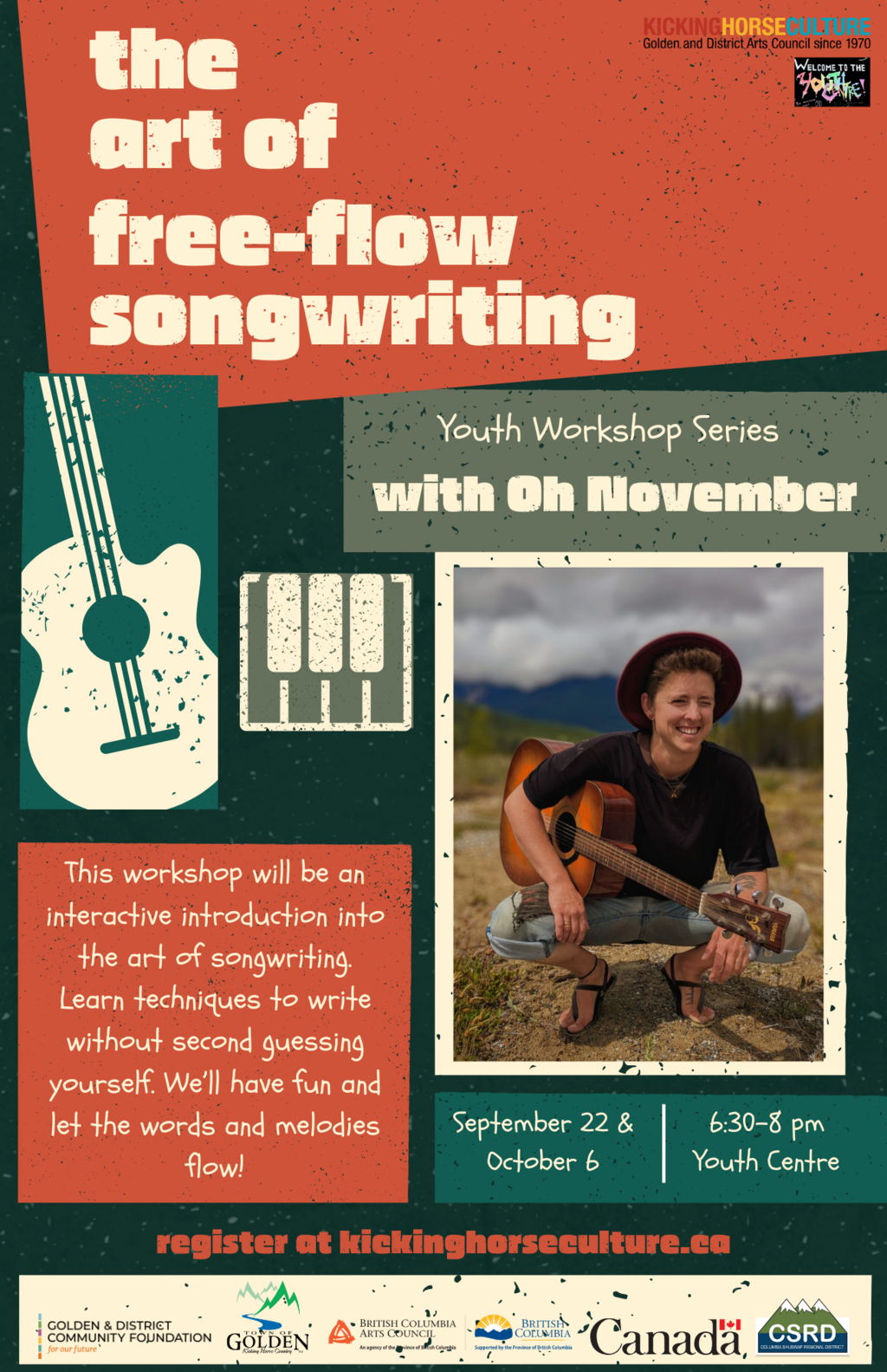 This youth workshop series with local musician Oh November will be an interactive introduction into the art of songwriting. Specifically, we will learn and work on techniques to write without second guessing yourself, to have fun and let the words and melodies flow, and even attempt to write a song as a group. By the end, you will gain a greater confidence in being your authentic creative self!