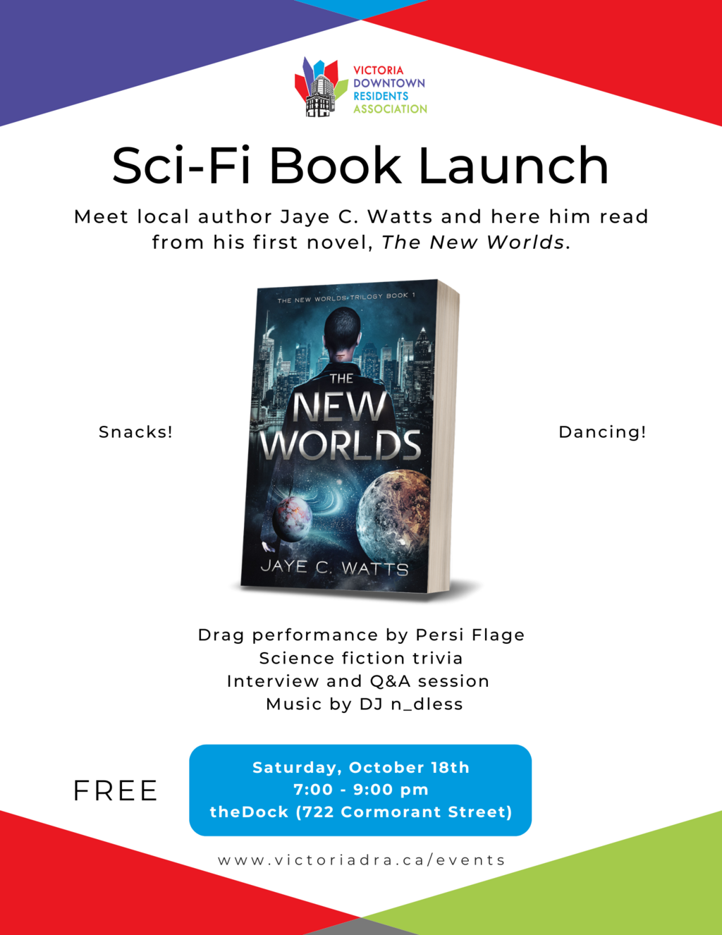 Join the Victoria Downtown Residents Association and local author Jaye C. Watts to celebrate the launch of his first book, The New Worlds, a dystopian science fiction novel. This FREE event will feature a reading from the book, along with a short interview and Q&A session with Jaye. There will also be a special, never-before-seen space-themed drag performance by Persi Flage, sci-fi trivia and prizes, snacks, and music by DJ n_dless.