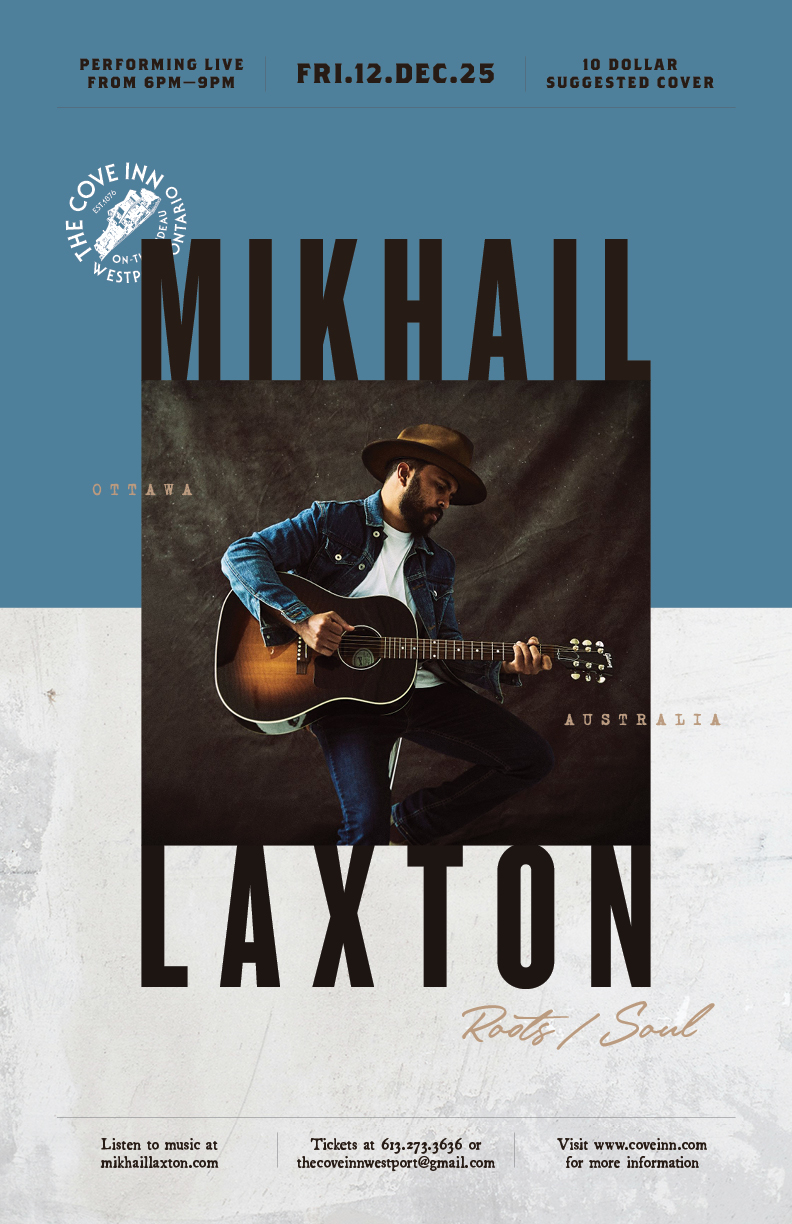 Mikhail Laxton seamlessly flows between Americana, Country, Folk Rock, Blues and more, as indefinable as Laxton himself, and ranges in topic from loss and longing, to the nostalgia for home, to moments of love. Hear this magnetic performer on the Cove patio stage on Friday, December 12th, 2025 from 6 to 9 PM.