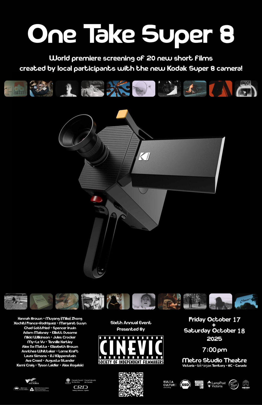 The One Take Super 8 is a decentralized network of filmmaking challenges and screenings presented across the globe. It was started in the year 2000 by Alex Rogalski in Regina, Saskatchewan — since then it has inspired the creation and screening of thousands of films in more than 50 international locations. CineVic proudly brings OTS8 back again for its 6th edition on Vancouver Island, and the 25th anniversary of the founding event.
