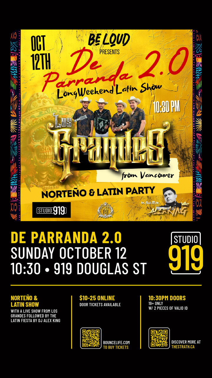 🌟 This Long Weekend the most anticipated Latin party returns to Victoria BC: De Parranda 2.0! 🌟 On Sunday, October 12th starting at 10:30 pm at Studio 919 by Sticky Wicket, get ready for a unique, special night full of fun and excitement.