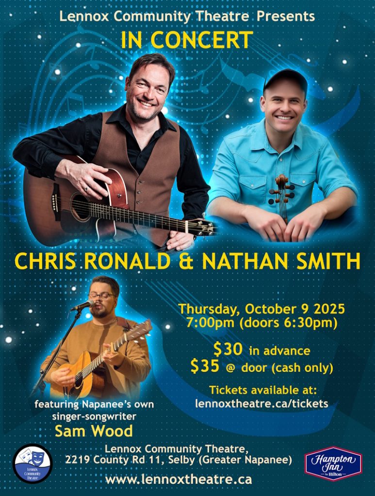 East meets West as Chris Ronald and Nathan Smith join forces. Based in Vancouver, Chris’ “keenly luxuriant voice and immaculate songcraft” have won him many accolades including a nomination for Songwriter of the Year at the Canadian Folk Music Awards. Based in Smith Falls, Nathan is a fiddle player in constant demand as a performer, educator, and session player. Local talent Sam Wood in support.