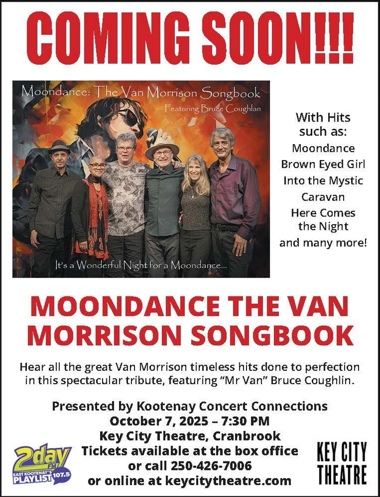 Bruce Coughlan channels “Van the Man,” a mystic Celtic soul singer whose career spans over five decades, from his early days with Them in the ‘60s to his groundbreaking ‘70s albums like Moondance, and Van Morrison His Band, and the Street Choir. With classics like “And It Stoned Me,” “Crazy Love,” and “Caravan,” Morrison’s distinctive sound remains a staple of classic rock and blues. This show, fueled by Coughlan’s award-winning interpretive skill and the band’s dynamic energy, promises a night of unforgettable music. This unique show will play the Kelowna Community Theatre on October 5th, October 6th at the Charles Bailey theatre in Trail, and October 7th at Cranbrook’s Key City theatre. All showtime’s are 7:30 pm. Moondance- the Van Morrison Songbook Experience is a presentation of the Kootenay Concert Connection. Tickets go on sale April 25th at the usual theatre ticket outlets in each area.
